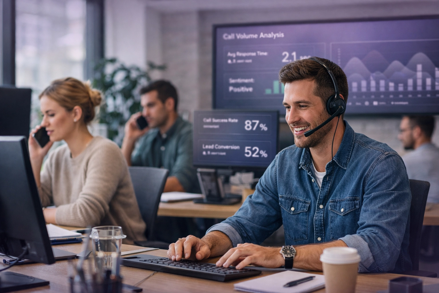 Modern corporate office team reviewing AI-qualified lead updates in a collaborative workspace.